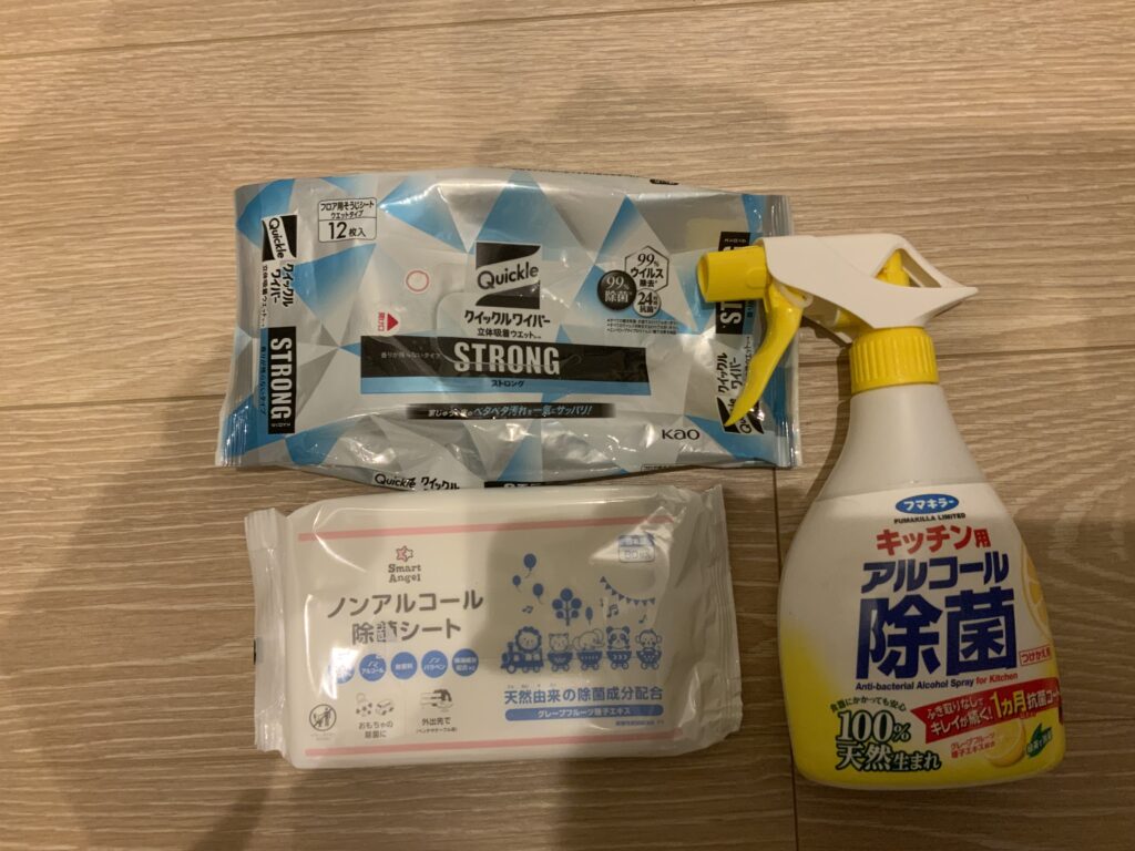 家具や柵などは一般的な除菌タイプのウェットシートで、床はクイックルワイパーの除菌ウェットタイプのもので掃除してます。