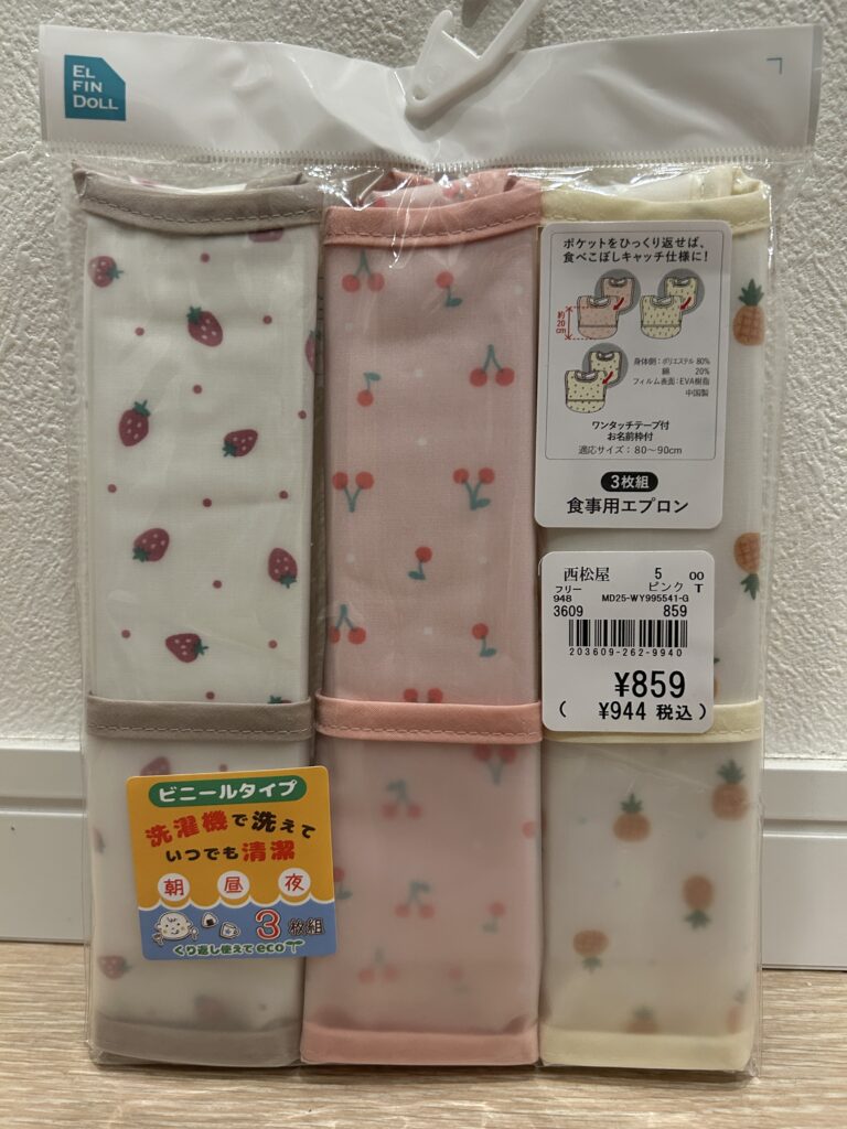 入園後、思ったよりエプロンの消費が早いと感じて以来、買い足しは西松屋に行くようになりました。