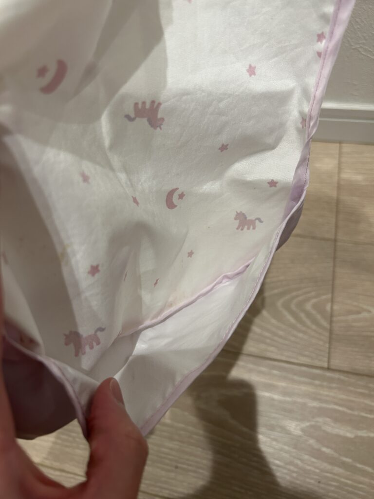 我が家は0歳児クラスの入園(1日3枚エプロン使用)。シリコン、不織布エプロンNGの事例です。