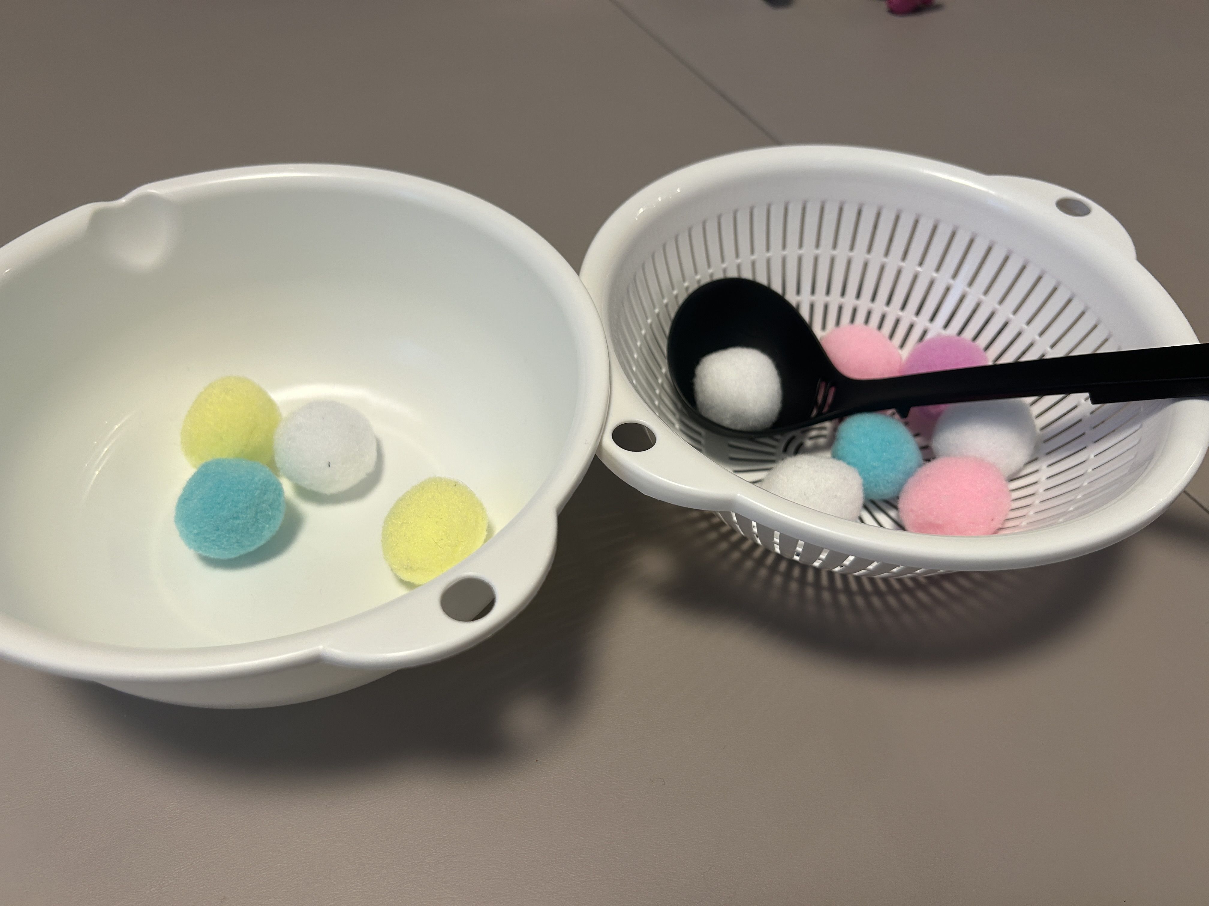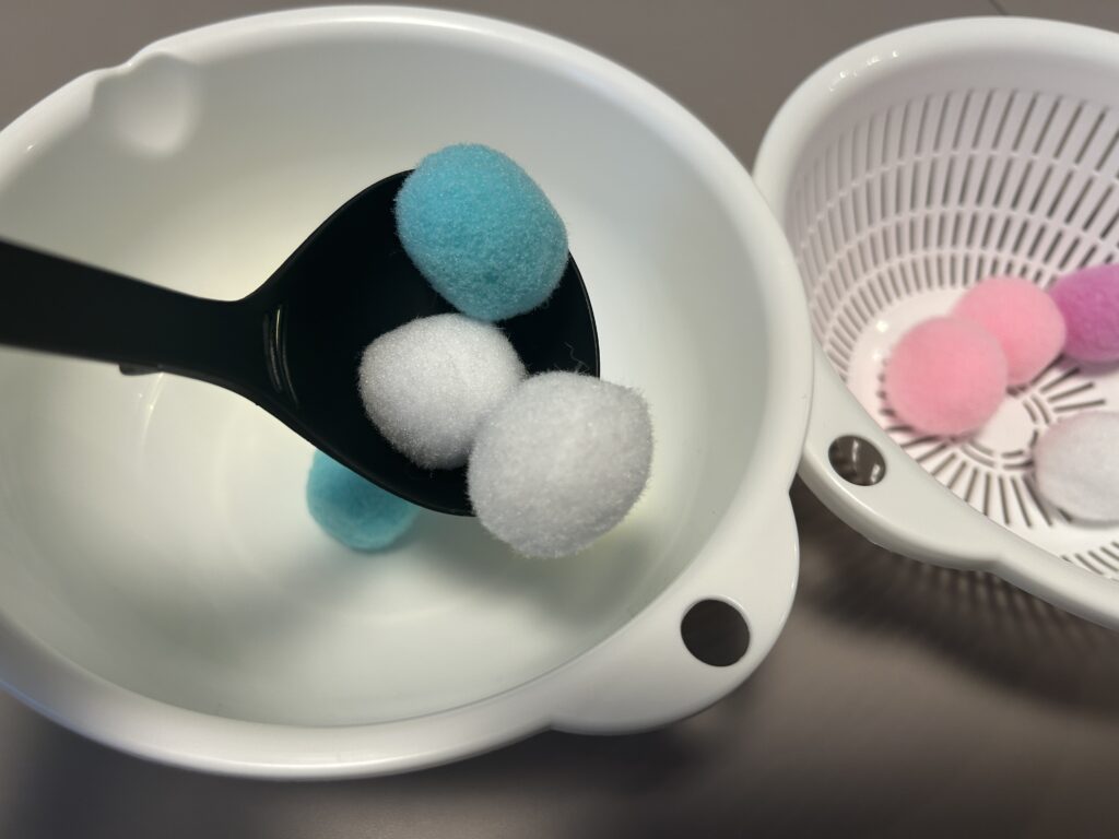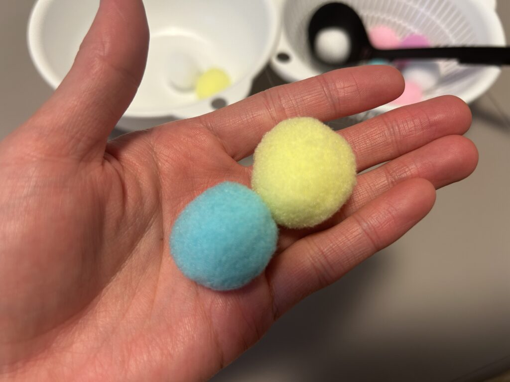 最初の30秒くらいはおたまですくおうとするのですが‥うまくできずにイライラするのか手でボールを掴んでしまう場面が多いです。